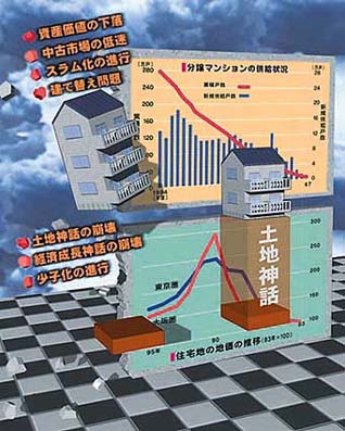 マンションのパンフレットの中のビジュアル。土地神話が崩壊した後、従来の分譲マンションにはいくつかの問題点があることを表現しています。