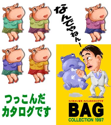 鞄(カバン)カタログの表紙案のカンプ。「カバン」と「カバ」のボケにツッコミを入れられているという関西系ギャグ。くだらないけど、キュートなカバちゃんたちが魅力的でしょ。案としてはウケましたが、この軽薄さに、クライアントは二の足を踏んだようです。紙を使わず下絵からペインターで描きました。
