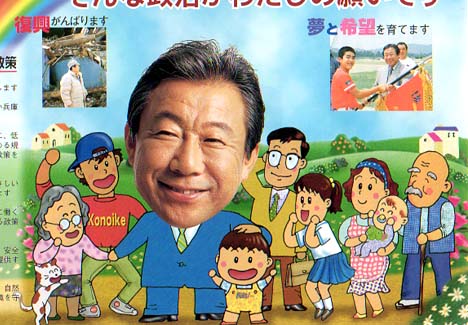 国会議員さんの選挙用チラシです。顔だけは絵でなく写真でアピールしたいという場合もあります。イラストは線画をスキャンしてフォトショップで着色。